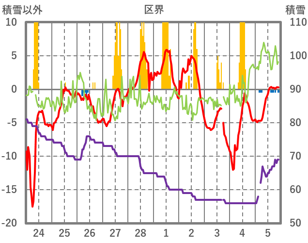 | 日 | 時 | 気温 | 降水 | 風向/風速 | 日照 | 積雪 | 降雪 |
