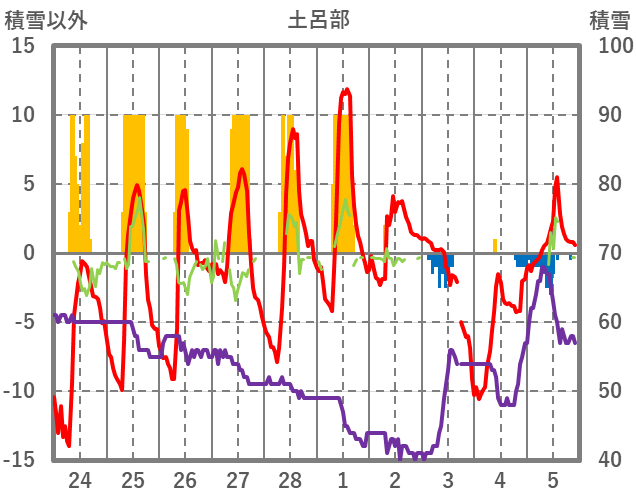 | 日 | 時 | 気温 | 降水 | 風向/風速 | 日照 | 積雪 | 降雪 |