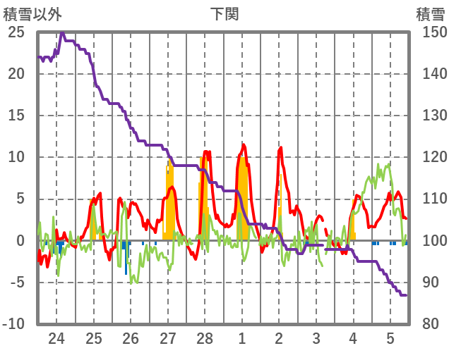 | 日 | 時 | 気温 | 降水 | 風向/風速 | 日照 | 積雪 | 降雪 |
