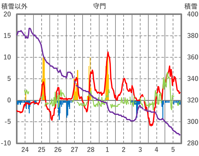 | 日 | 時 | 気温 | 降水 | 風向/風速 | 日照 | 積雪 | 降雪 |