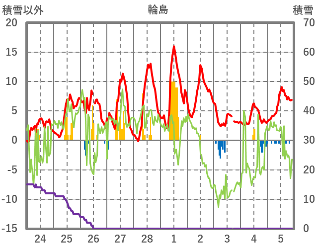 | 日 | 時 | 気温 | 降水 | 風向/風速 | 日照 | 積雪 | 降雪 |