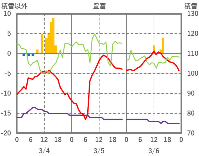 | 日 | 時 | 気温 | 降水 | 風向/風速 | 日照 | 積雪 | 降雪 |