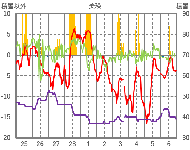 | 日 | 時 | 気温 | 降水 | 風向/風速 | 日照 | 積雪 | 降雪 |
