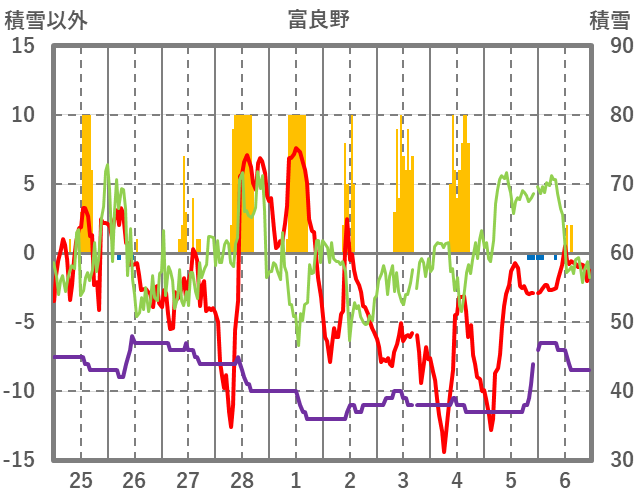 | 日 | 時 | 気温 | 降水 | 風向/風速 | 日照 | 積雪 | 降雪 |