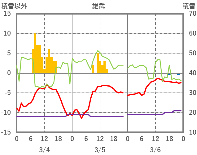 | 日 | 時 | 気温 | 降水 | 風向/風速 | 日照 | 積雪 | 降雪 |
