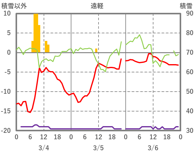 | 日 | 時 | 気温 | 降水 | 風向/風速 | 日照 | 積雪 | 降雪 |