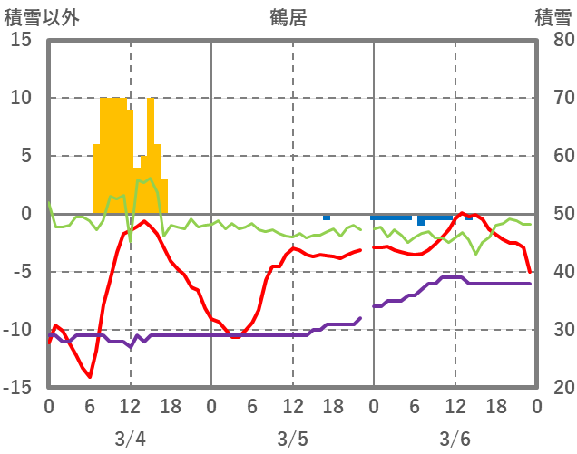 | 日 | 時 | 気温 | 降水 | 風向/風速 | 日照 | 積雪 | 降雪 |