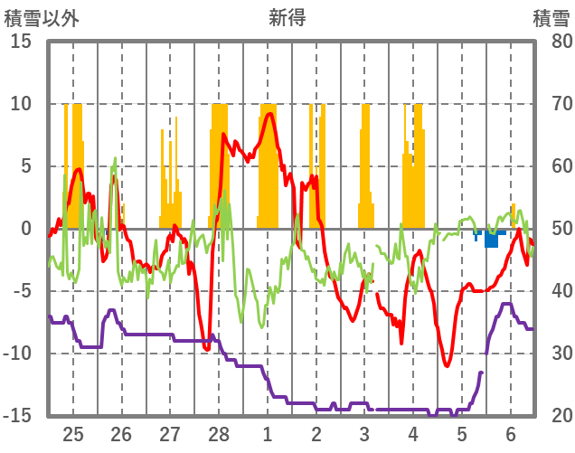 | 日 | 時 | 気温 | 降水 | 風向/風速 | 日照 | 積雪 | 降雪 |