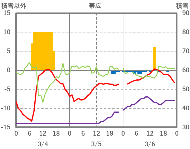 | 日 | 時 | 気温 | 降水 | 風向/風速 | 日照 | 積雪 | 降雪 |