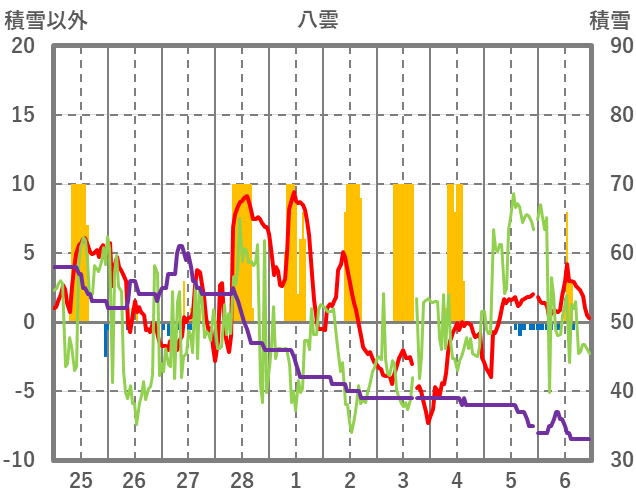 | 日 | 時 | 気温 | 降水 | 風向/風速 | 日照 | 積雪 | 降雪 |