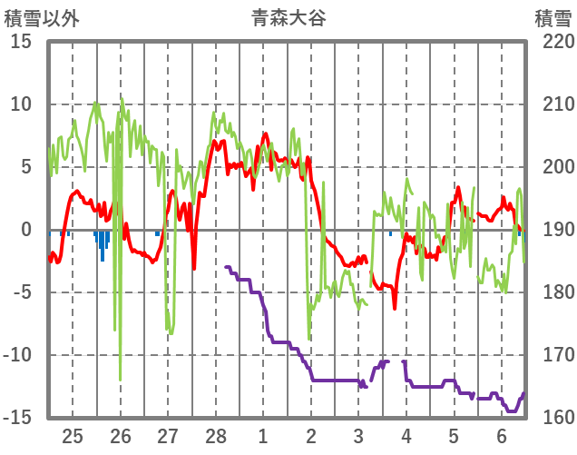 | 日 | 時 | 気温 | 降水 | 風向/風速 | 日照 | 積雪 | 降雪 |