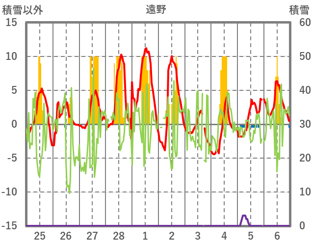 | 日 | 時 | 気温 | 降水 | 風向/風速 | 日照 | 積雪 | 降雪 |