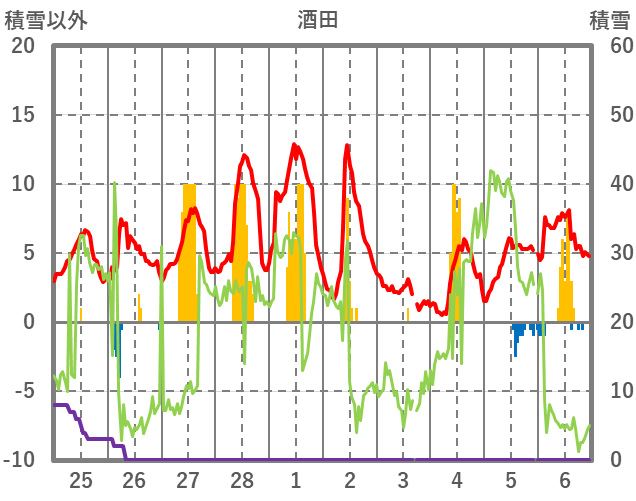 | 日 | 時 | 気温 | 降水 | 風向/風速 | 日照 | 積雪 | 降雪 |