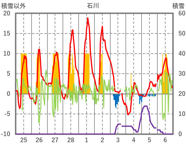 | 日 | 時 | 気温 | 降水 | 風向/風速 | 日照 | 積雪 | 降雪 |