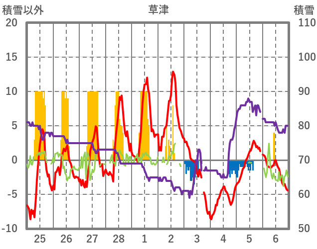| 日 | 時 | 気温 | 降水 | 風向/風速 | 日照 | 積雪 | 降雪 |
