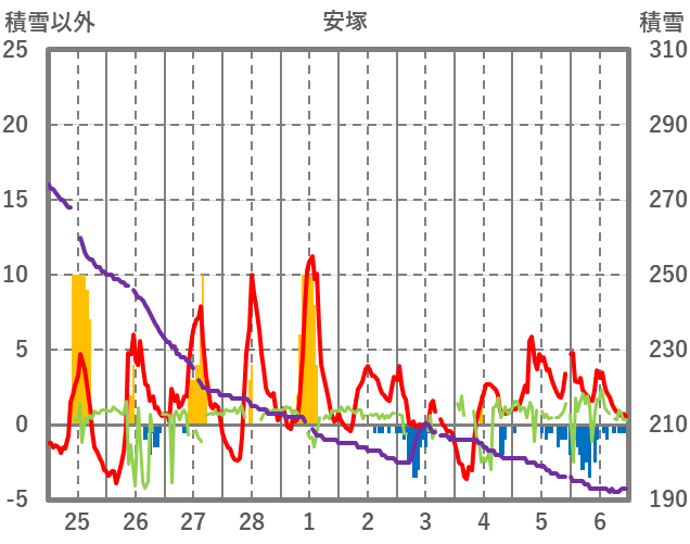 | 日 | 時 | 気温 | 降水 | 風向/風速 | 日照 | 積雪 | 降雪 |