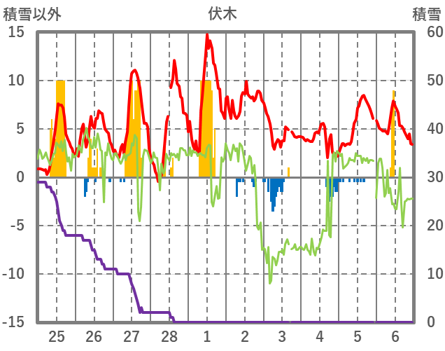 | 日 | 時 | 気温 | 降水 | 風向/風速 | 日照 | 積雪 | 降雪 |
