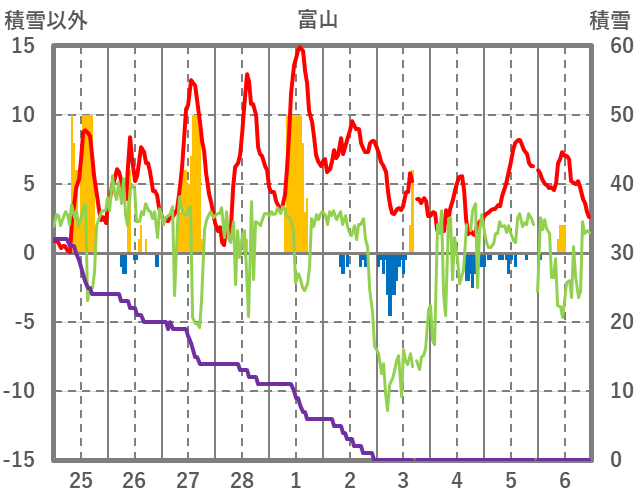| 日 | 時 | 気温 | 降水 | 風向/風速 | 日照 | 積雪 | 降雪 |
