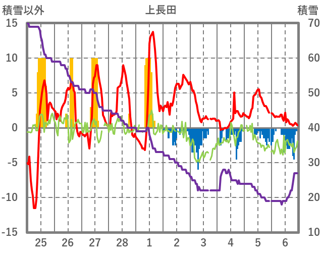 | 日 | 時 | 気温 | 降水 | 風向/風速 | 日照 | 積雪 | 降雪 |