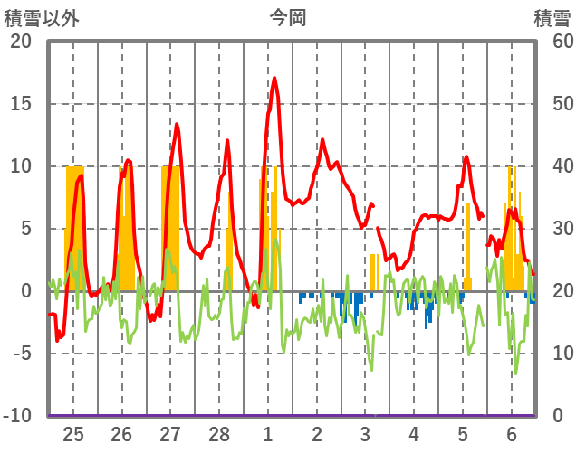 | 日 | 時 | 気温 | 降水 | 風向/風速 | 日照 | 積雪 | 降雪 |