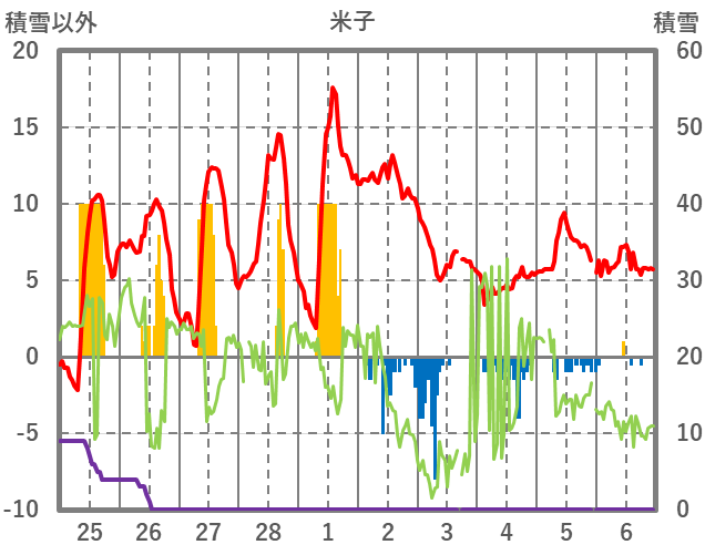 | 日 | 時 | 気温 | 降水 | 風向/風速 | 日照 | 積雪 | 降雪 |