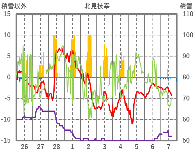 | 日 | 時 | 気温 | 降水 | 風向/風速 | 日照 | 積雪 | 降雪 |