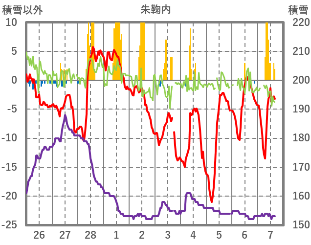 | 日 | 時 | 気温 | 降水 | 風向/風速 | 日照 | 積雪 | 降雪 |