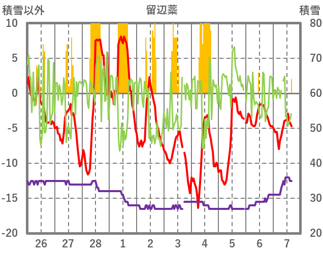 | 日 | 時 | 気温 | 降水 | 風向/風速 | 日照 | 積雪 | 降雪 |