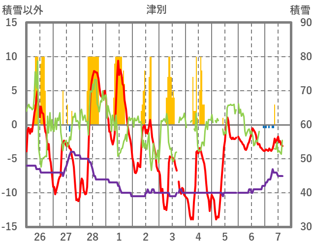 | 日 | 時 | 気温 | 降水 | 風向/風速 | 日照 | 積雪 | 降雪 |