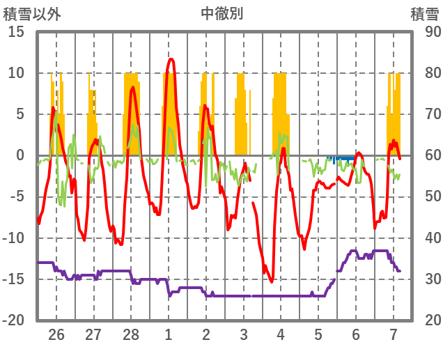 | 日 | 時 | 気温 | 降水 | 風向/風速 | 日照 | 積雪 | 降雪 |