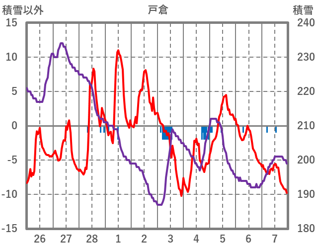 | 日 | 時 | 気温 | 降水 | 風向/風速 | 日照 | 積雪 | 降雪 |
