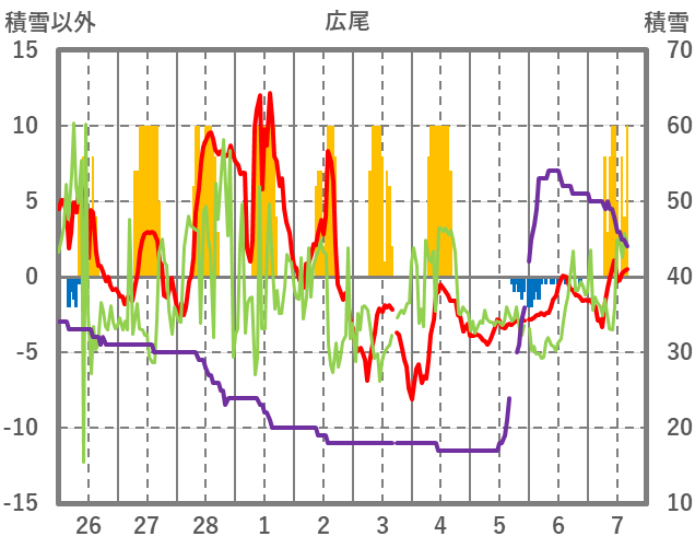 | 日 | 時 | 気温 | 降水 | 風向/風速 | 日照 | 積雪 | 降雪 |