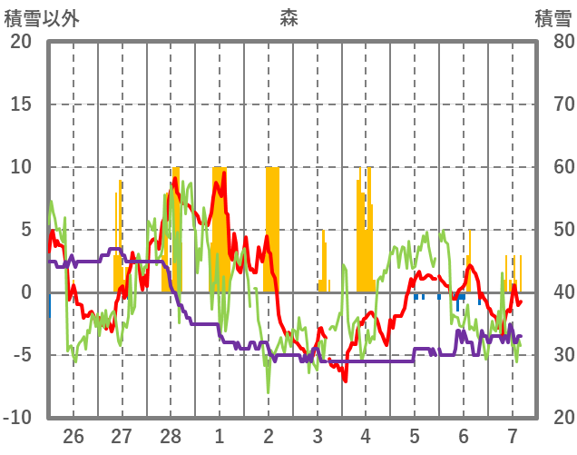 | 日 | 時 | 気温 | 降水 | 風向/風速 | 日照 | 積雪 | 降雪 |