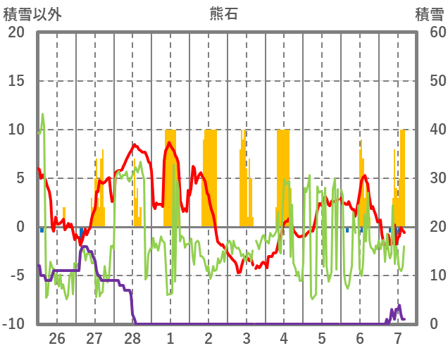| 日 | 時 | 気温 | 降水 | 風向/風速 | 日照 | 積雪 | 降雪 |
