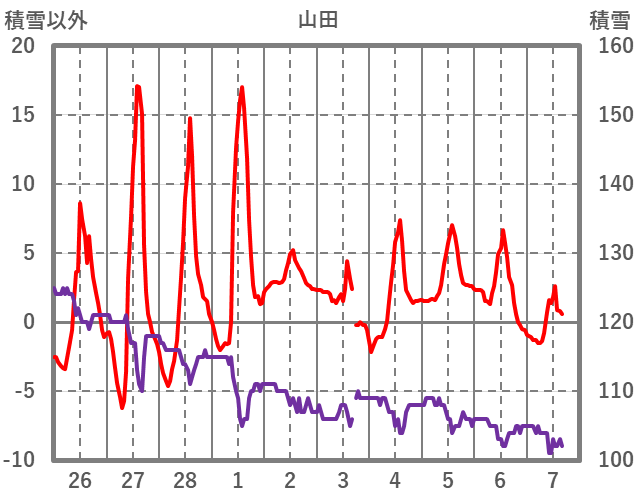 | 日 | 時 | 気温 | 降水 | 風向/風速 | 日照 | 積雪 | 降雪 |