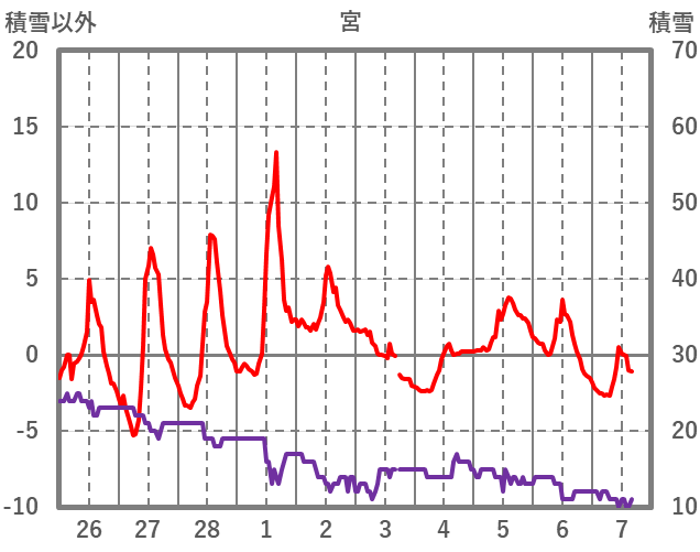 | 日 | 時 | 気温 | 降水 | 風向/風速 | 日照 | 積雪 | 降雪 |
