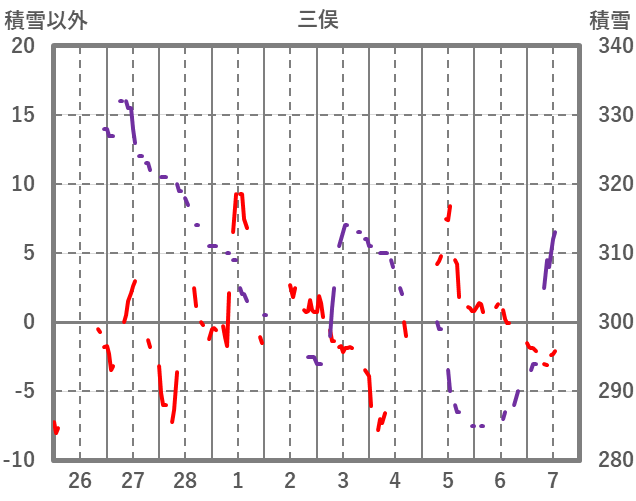 | 日 | 時 | 気温 | 降水 | 風向/風速 | 日照 | 積雪 | 降雪 |