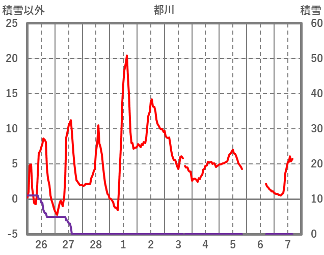 | 日 | 時 | 気温 | 降水 | 風向/風速 | 日照 | 積雪 | 降雪 |