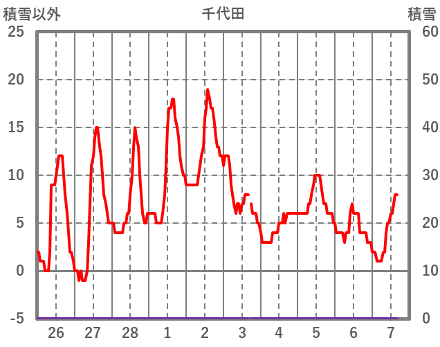 | 日 | 時 | 気温 | 降水 | 風向/風速 | 日照 | 積雪 | 降雪 |