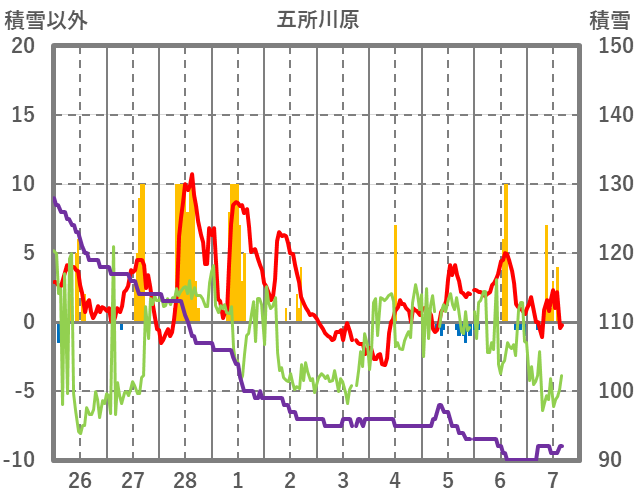 | 日 | 時 | 気温 | 降水 | 風向/風速 | 日照 | 積雪 | 降雪 |