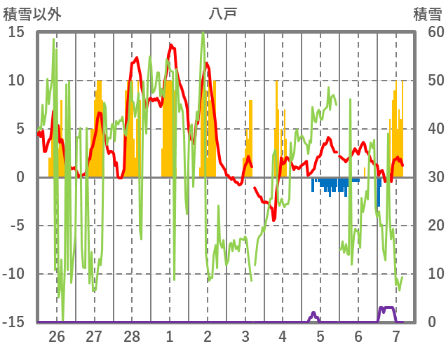 | 日 | 時 | 気温 | 降水 | 風向/風速 | 日照 | 積雪 | 降雪 |