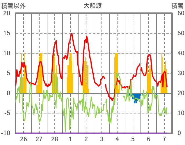 | 日 | 時 | 気温 | 降水 | 風向/風速 | 日照 | 積雪 | 降雪 |