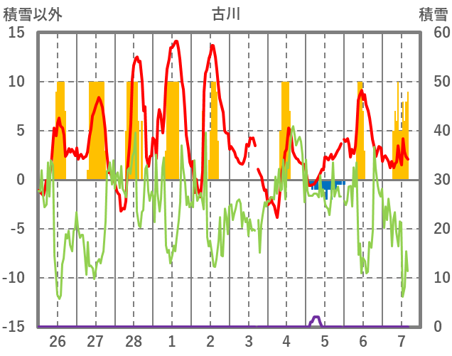| 日 | 時 | 気温 | 降水 | 風向/風速 | 日照 | 積雪 | 降雪 |