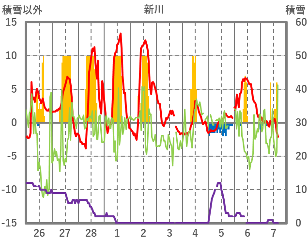 | 日 | 時 | 気温 | 降水 | 風向/風速 | 日照 | 積雪 | 降雪 |