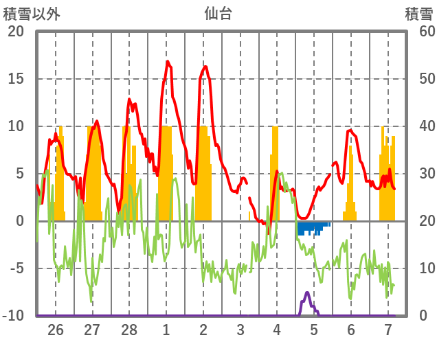| 日 | 時 | 気温 | 降水 | 風向/風速 | 日照 | 積雪 | 降雪 |