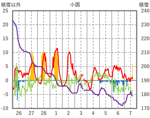 | 日 | 時 | 気温 | 降水 | 風向/風速 | 日照 | 積雪 | 降雪 |