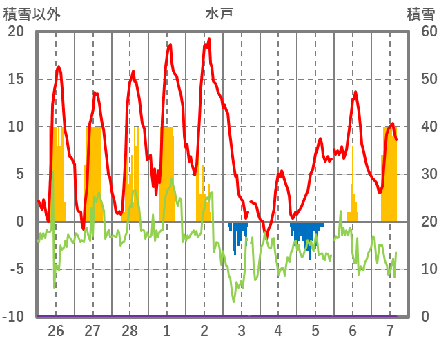 | 日 | 時 | 気温 | 降水 | 風向/風速 | 日照 | 積雪 | 降雪 |