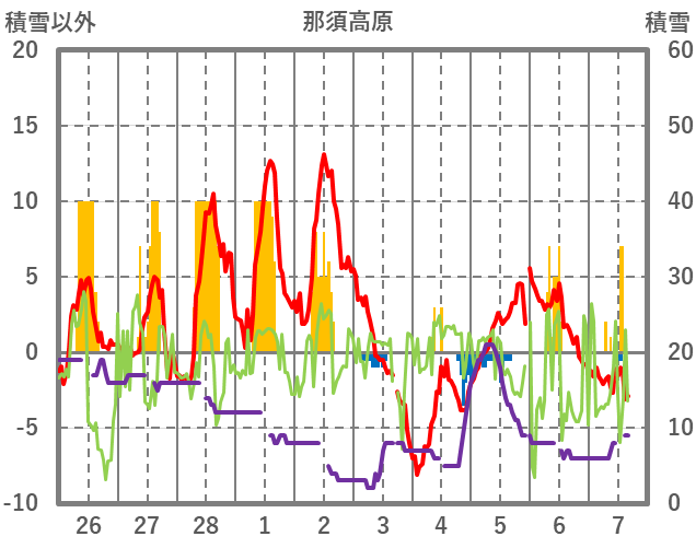 | 日 | 時 | 気温 | 降水 | 風向/風速 | 日照 | 積雪 | 降雪 |