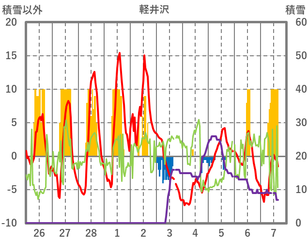 | 日 | 時 | 気温 | 降水 | 風向/風速 | 日照 | 積雪 | 降雪 |