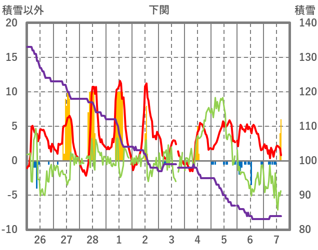 | 日 | 時 | 気温 | 降水 | 風向/風速 | 日照 | 積雪 | 降雪 |